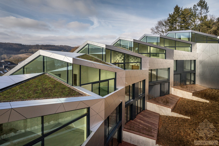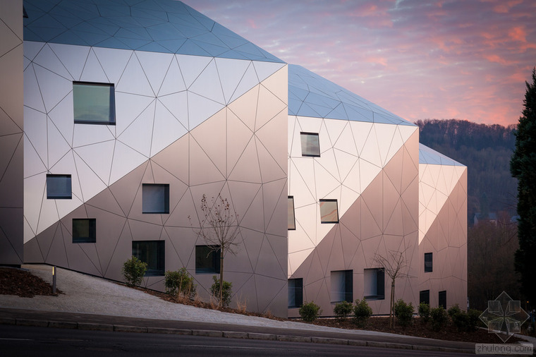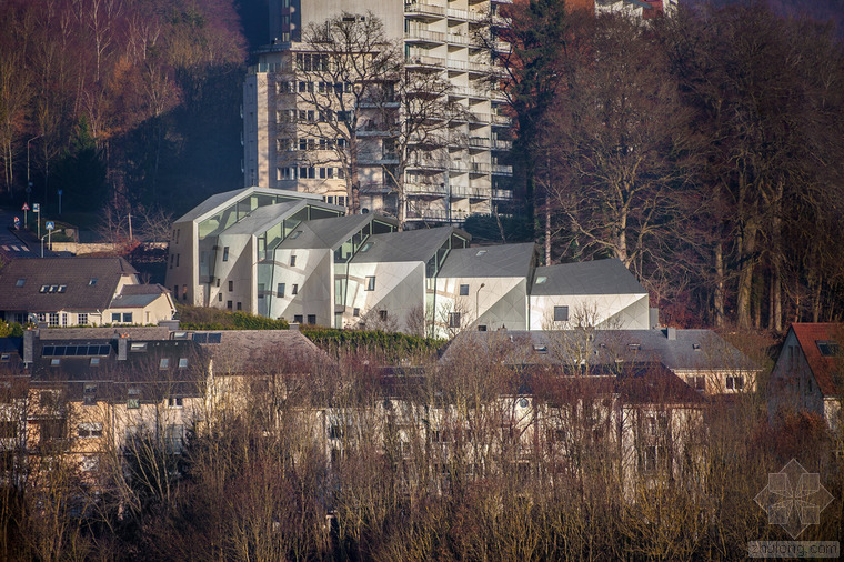 根據(jù)城市建筑規(guī)章條例規(guī)范,無論地形有多奇怪,都可以建造簡易的兩層單體建筑,并且?guī)в械叵率?。但是,周圍的環(huán)境、特殊的地形條件和基地的形式造就了各種各樣的建筑,與此同時(shí)也產(chǎn)生了上文所指出的問題?;匚挥谝粭l十分彎曲的街道邊緣;地形高差達(dá)10米,非常陡峭;基地上保留有樹齡300年的古樹,且被列為國家歷史文物。所有的這些狀況使建筑有了最初的形狀。此外,該建筑還呼應(yīng)了特殊的城市環(huán)境(一邊是小體量的住宅單元,而另一邊是大體量的公寓樓。)建筑師通過將主體分成六個(gè)小的、垂直位移的體塊,創(chuàng)造了一個(gè)巧妙地轉(zhuǎn)變。建筑通過這種方法適應(yīng)了環(huán)境,既保持了所需的密度,又賦予其歸屬感、特性和人性化。體塊的分割和位移需要謹(jǐn)慎地研究自然采光的需求、朝向城市景觀的開闊視野,并且創(chuàng)造天地之間的視覺連接,同時(shí)還要保護(hù)住戶的隱私。