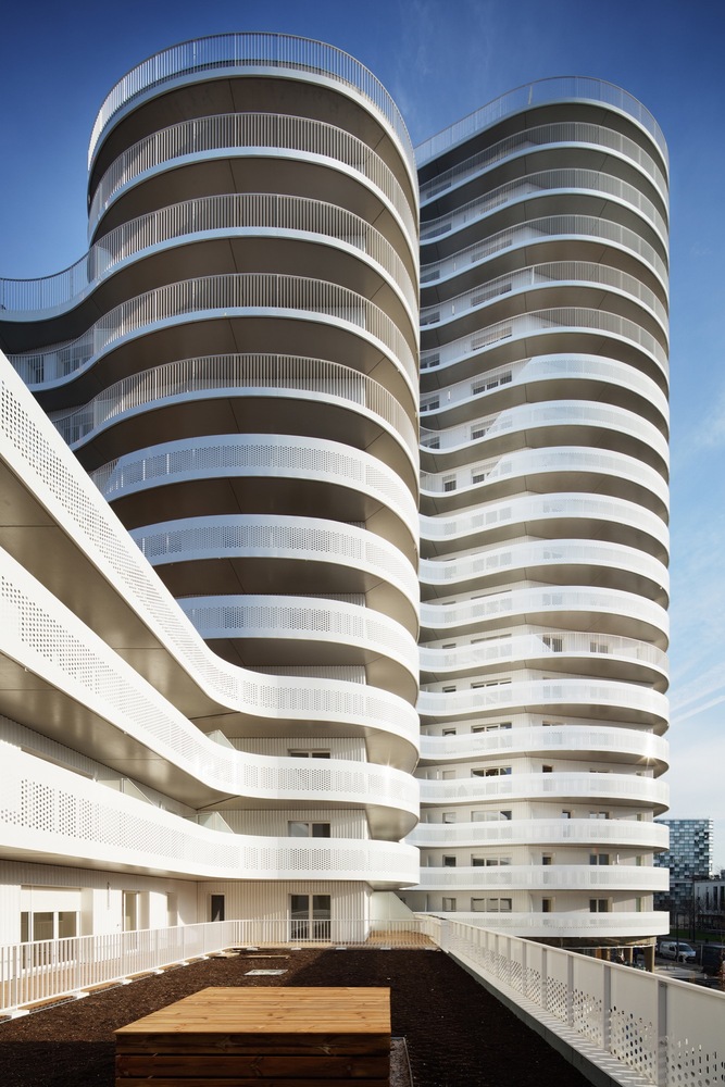 這是一棟建造于核心區(qū)位的獨(dú)特建筑。New’R大樓由流線型的折角和四周波浪起伏的陽(yáng)臺(tái)構(gòu)成,這樣的造型設(shè)計(jì)不僅是在向奧斯卡•尼邁耶致敬,還是在向上世紀(jì)七十年代法國(guó)里維埃拉的建筑(例如由André Minangoy 和 Michel Marot設(shè)計(jì)的天使灣碼頭)致敬,最后還暗示了快樂(lè)主義者對(duì)邁阿密海灘的幻想。這座建筑顯得感性而又賦有多向性,其所在位置在“畢加索郵路”和目前沿鐵路基礎(chǔ)設(shè)施設(shè)置的、尚處于開(kāi)發(fā)階段的新住區(qū)之間的重要節(jié)點(diǎn)上。New’R大樓對(duì)現(xiàn)有場(chǎng)地的構(gòu)建體現(xiàn)在對(duì)基地形成的環(huán)擁之勢(shì)和對(duì)新景觀的塑造。